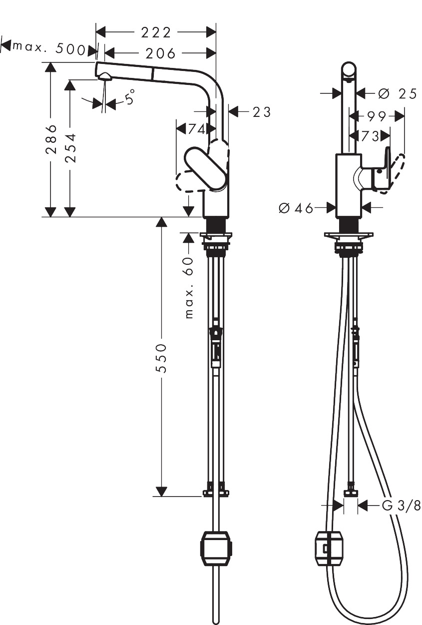 描述水槽龙头和水槽之间在垂直和水平方向产生的宽敞空间。这些高质量的龙头非常人性化,具有灵活的旋转范围。以获得最大的移动空间。